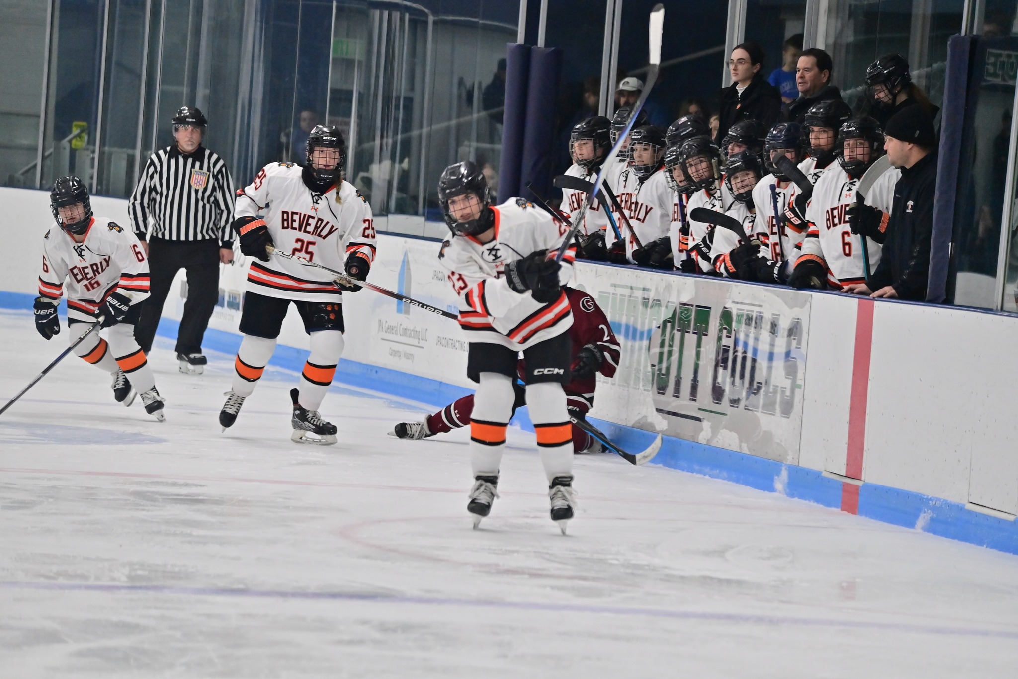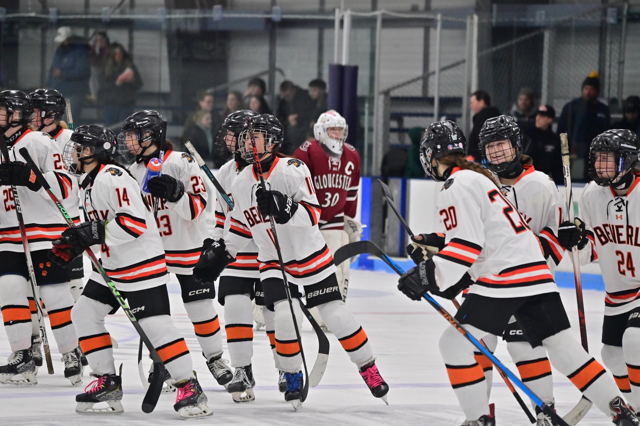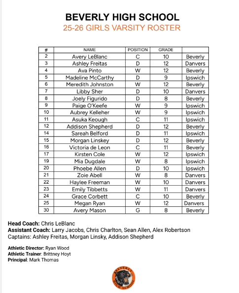 The Girls Varsity Ice Hockey team at Beverly High School competes with speed, toughness, and strong teamwork throughout the winter season. The program emphasizes skill development, discipline, and preparation while facing competitive opponents. Through dedicated practices and game play, the team represents Beverly with pride and commitment on the ice.